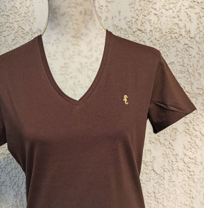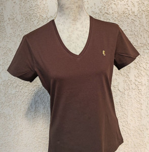 T-Shirt femme col V, broderie "Hippocampe" en fil doré