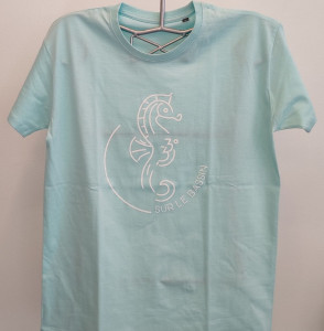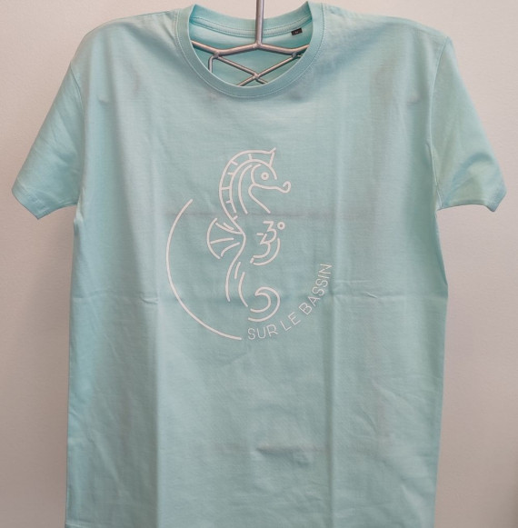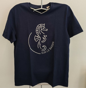 Ce t-shirt homme et femme, marqué de l'hippocampe, emblème des villes d'Arcachon et de La-Teste-de-Buch, met en valeur cet animal dont l'habitat est protégé.